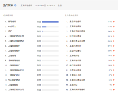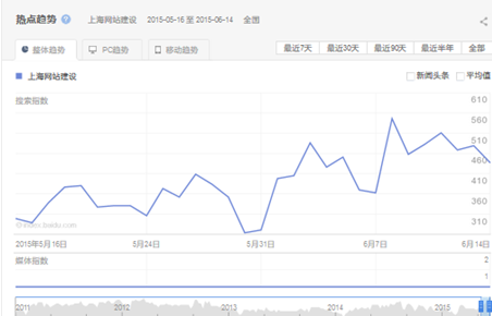 熱點(diǎn)趨勢(shì)圖顯示的是上海網(wǎng)站建設(shè)在近30天內(nèi)每天的搜索走勢(shì)。2015年6月14日有接近490的搜索指數(shù)。
